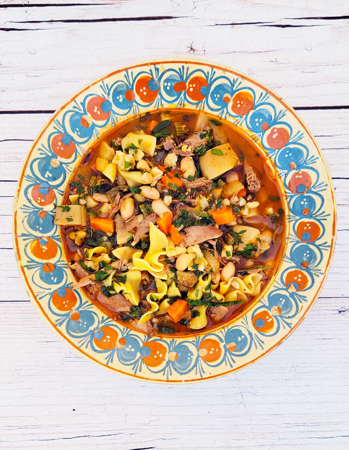 Think of this prairie chicken soup as Italian pasta e fagioli (“pasta fuhzool”) meets the Nebraska prairies. It’s a hearty soup loaded with good things — and it works with most meats, not just the hard-to-get prairie chicken.